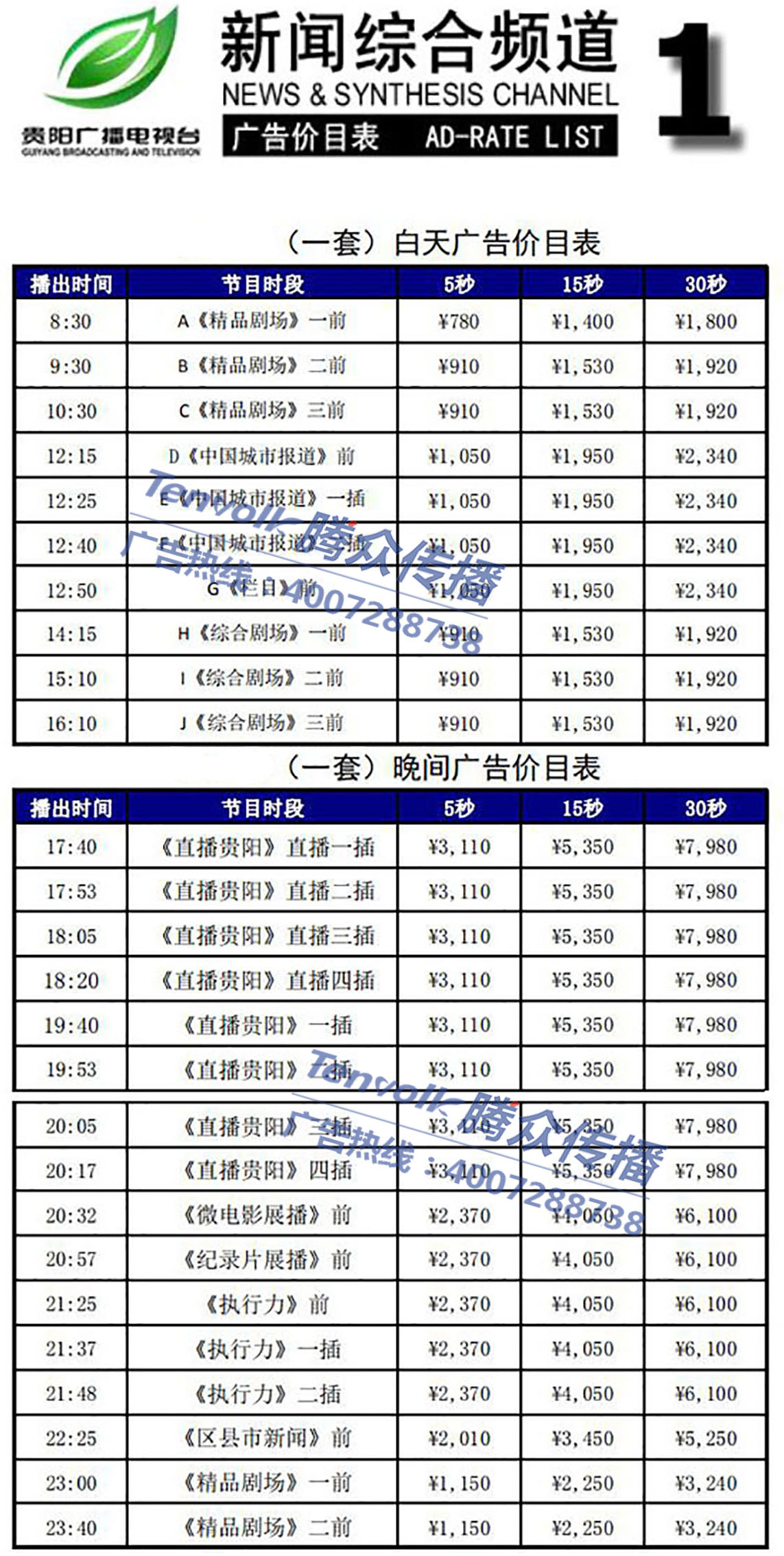 具体贵阳新闻综合频道广告投放价格及广告折扣请咨询客服:400-7288-738