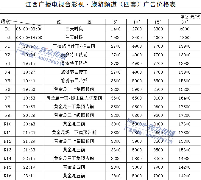 具体江西电视台旅游频道广告投放价格及广告折扣请咨询客服:400-7288-738