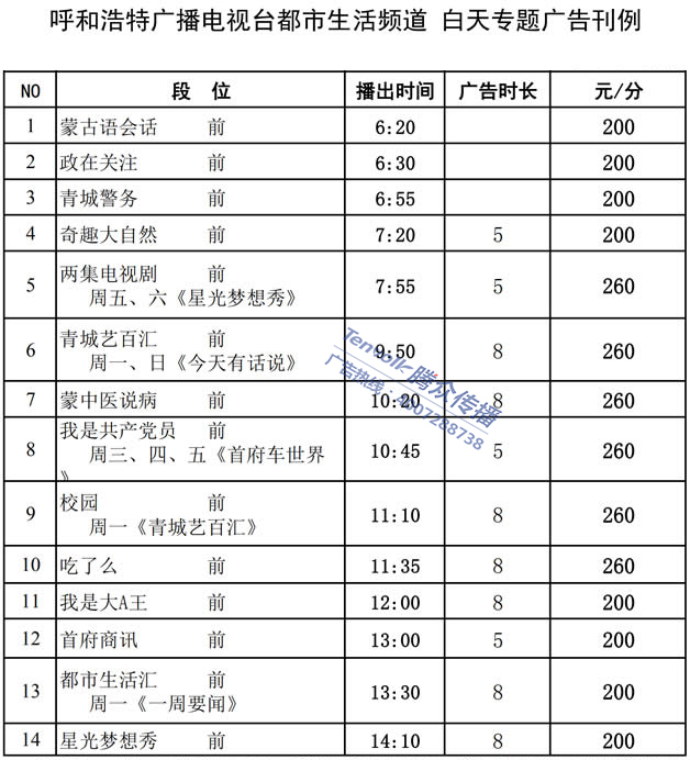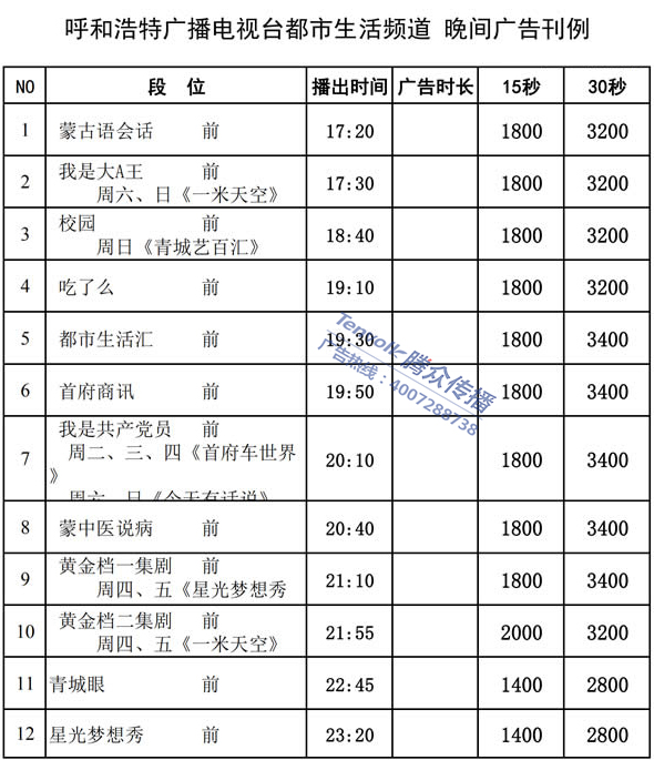 呼和浩特都市生活频道:数字有线传输,覆盖市区及下辖所有旗县区。频道以播出适合城市居民欣赏品味的各类影视剧、栏目为特点。以“都市生活,我们和你在一起”为口号,反映当地社情民意、风土人情。其中自办栏目《访谈》、《青城纪事》、《都市生活汇》、《蒙中医说病》、《少儿乐园》以及引进栏目《寰宇地理》、《快乐生活一点通》等节目均有不俗的收视表现。想了解更多的呼和浩特都市频道广告投放信息,请拨打呼和浩特都市频道广告中心电话:400-7288-738。