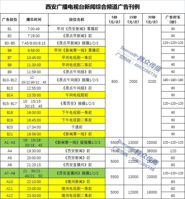 西安电视台一套新闻综合频道简介 《西安电视台一套新闻综合频道》在围绕新闻的本土化、信息量大、服务性强等方面作文章,从而体现主频道权威、真实、及时、庄重、大气的风格,树立起"家事、国事、天下事,新闻、新知、新西安"的主频道形象。 西安电视台一套新闻综合频道定位 《西安电视台一套新闻综合频道》以新闻立台,五档新闻聚焦天下;以创新造势。想了解更多的西安电视台新闻频道广告投放信息,请拨打西安电视台广告中心电话:400-7288-738