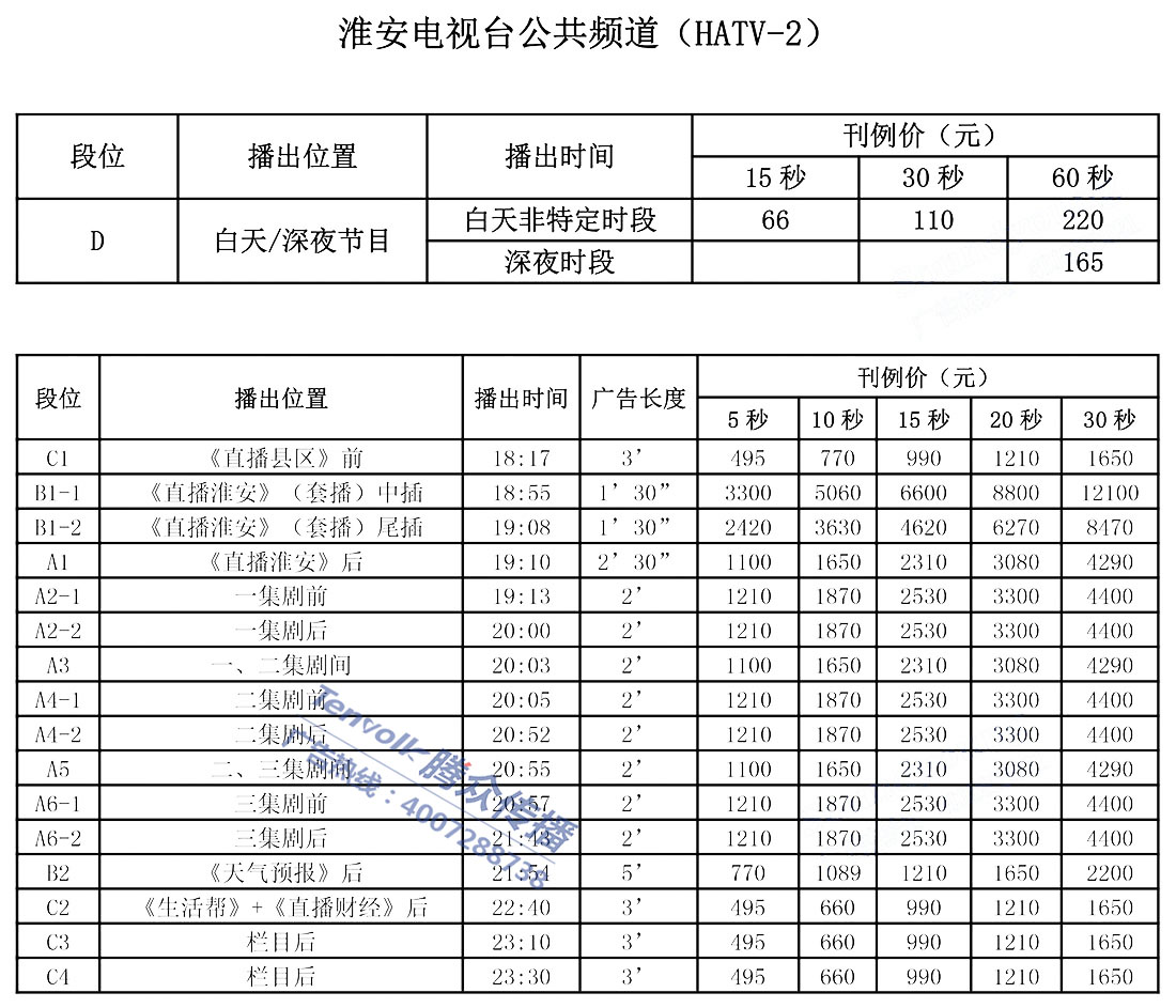 具体淮安电视台公共频道广告投放价格及广告折扣请咨询客服:400-7288-738